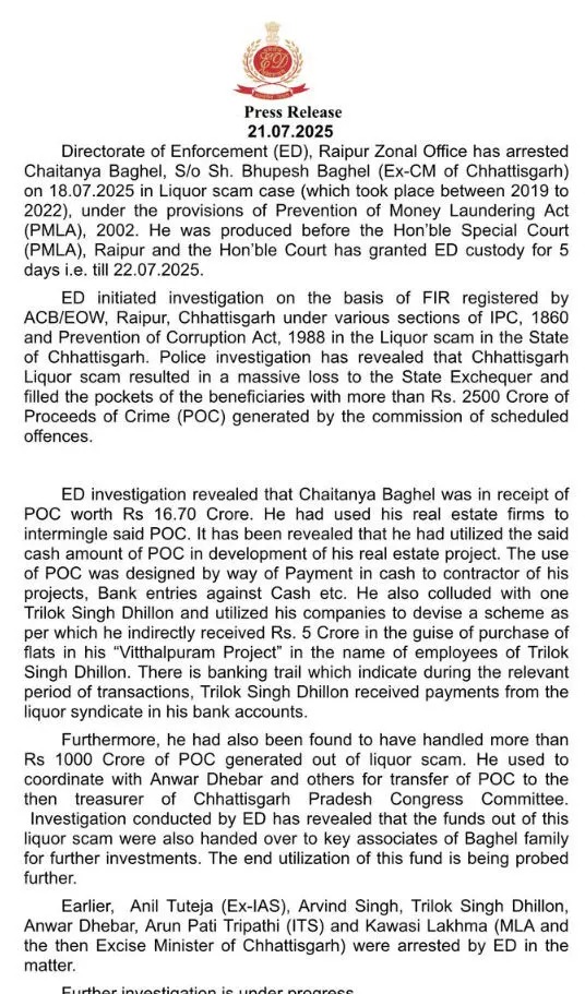 रायपुर। छत्तीसगढ़ में बहुचर्चित शराब घोटाले को लेकर प्रवर्तन निदेशालय (ED) ने बड़ी कार्रवाई करते हुए चैतन्य बघेल को गिरफ्तार किया है। ईडी द्वारा जारी प्रेस नोट में बताया गया है कि बघेल ने इस घोटाले के जरिए करीब 16 करोड़ 70 लाख रुपये की अवैध कमीशन प्राप्त की थी।
