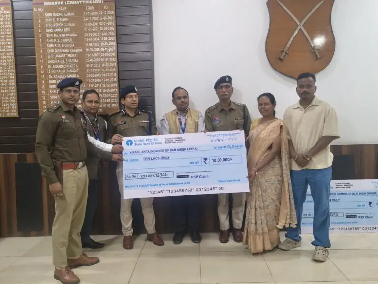स्वर्गीय प्रधान आरक्षक दिलीप ठाकुर की पत्नी सरस्वती सिंह ठाकुर और स्वर्गीय राम सिंह लकड़ा की पत्नी किरण लकड़ा को 10–10 लाख रुपये की बीमा राशि का चेक सौंपा गया।