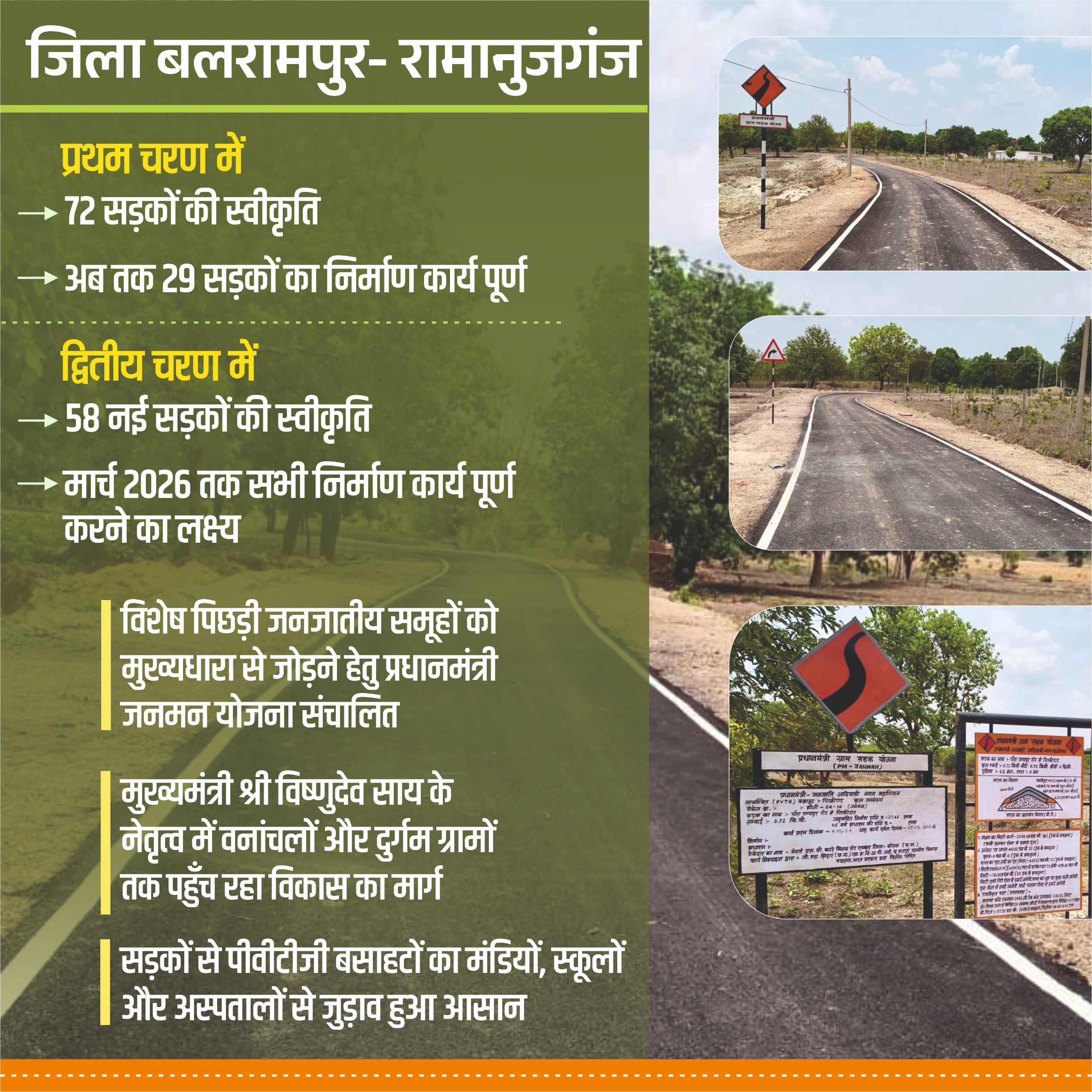 पीएम जनमन सड़क योजना अंतर्गत वर्ष 2024-25 में द्वितीय चरण में 58 नई सड़कों की स्वीकृति प्रदान की गई है। जिनकी कुल लम्बाई 117.93 कि.मी. है। इन सभी सड़कों का निर्माण कार्य प्रगति पर है। जिसे मार्च 2026 तक पूर्ण करने का लक्ष्य निर्धारित किया गया है। इन सड़कों के पूर्ण हो जाने से लगभग 13,888 लोग लाभान्वित होंगे। शासन-प्रशासन द्वारा पीवीटीजी बसाहटों में सड़क निर्माण प्राथमिकता से किया जा रहा है, ताकि शासन की अन्य योजनाएं भी इन बसाहटों तक सहज पहुंच सकेगी। सड़कों के पूर्ण हो जाने पर जिले लगभग सभी पीव्हीटीजी बसाहटें मुख्य सड़क नेटवर्क से जुड़ जाएंगी, जिसका सीधा लाभ ग्रामीणों को मिलेगा।