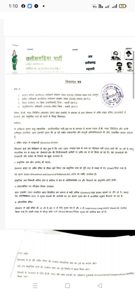 अब इस मामले में राजनीतिक दल के पदाधिकारी ने इस मामले में एक प्रेस विज्ञप्ति जारी कर हलचल मचा दी है है। सक्ती जिले में छत्तीसगढ़िया पार्टी के महासचिव अविनाश कुमार साहु ने इस मामले में प्रेस विज्ञप्ति जारी करते हुए कई गंभीर आरोप लगाए हैं। अविनाश कुमार साहु ने प्रेस विज्ञप्ति में दावा करते हुए कहा है कि इस मामले में एसईसीएल छाल उपक्षेत्र, डीबी पावर प्लांट और ट्रांसपोर्टर के द्वारा किए जा रहे पर्यावरणीय घोटाले का पर्दाफाश किया है।