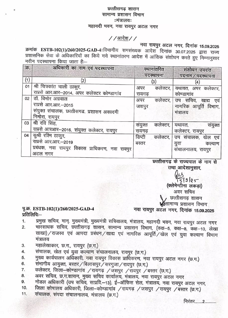 तबादला सूची में अपर कलेक्टर, संयुक्त कलेक्टर, डिप्टी कलेक्टर और उप सचिव स्तर के अधिकारी शामिल हैं।