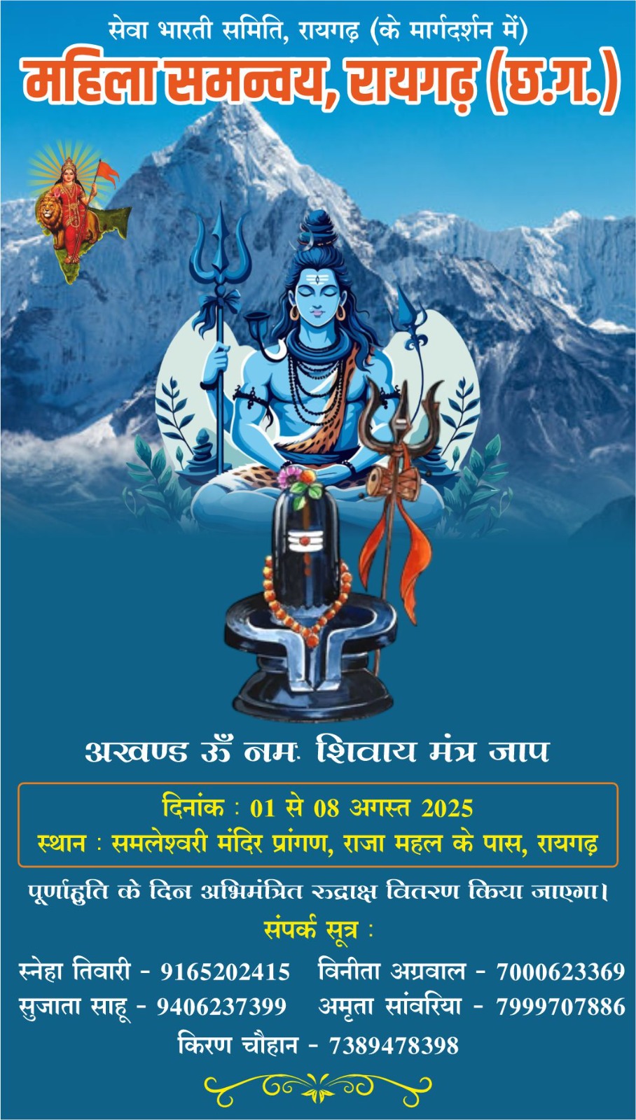 रायगढ़ (छ.ग.) – महिला समन्वय, रायगढ़ द्वारा 01 अगस्त से 08 अगस्त 2025 तक “अखण्ड ॐ नमः शिवाय मंत्र जाप” का आयोजन किया जा रहा है। यह आध्यात्मिक आयोजन रायगढ़ स्थित सम्मलेश्वरी मंदिर प्रांगण (राजा महल के पास) में संपन्न होगा।