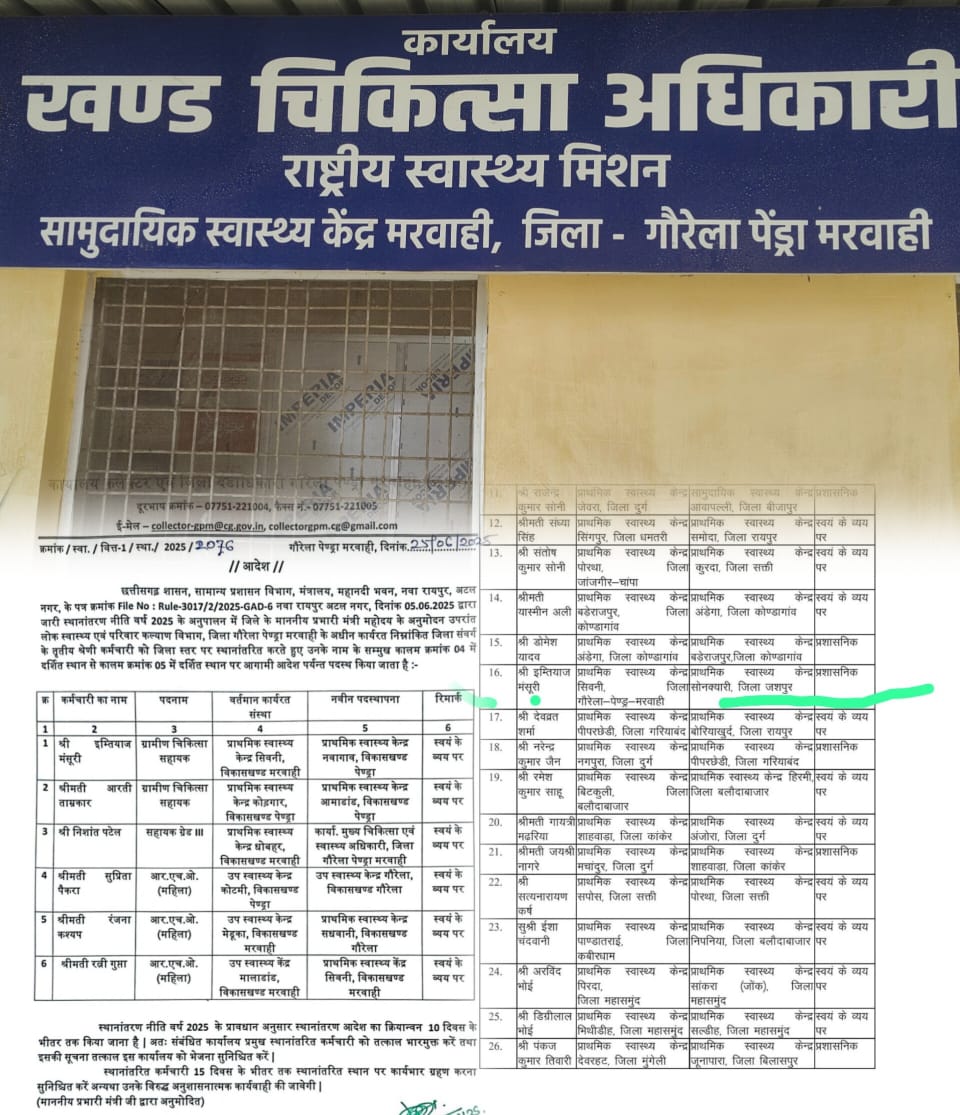 गौरेला-पेंड्रा-मरवाही_स्वास्थ्य विभाग की स्थानांतरण नीति पर एक बार फिर गंभीर सवाल उठ खड़े हुए हैं। ग्रामीण चिकित्सा अधिकारी इम्तियाज मंसूरी के मामले ने न केवल अधिकारियों की कार्यशैली बल्कि शासन के आदेशों की गंभीर अनदेखी को उजागर कर दिया है।