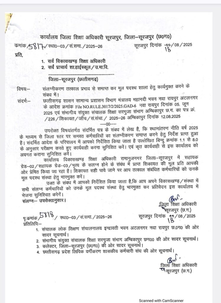 सूरजपुर। जिले में शिक्षा विभाग के कर्मचारियों के संलग्नीकरण को लेकर अब नई बहस शुरू हो गई है। जिला शिक्षा अधिकारी सूरजपुर ने सोमवार को रामानुजनगर विकासखण्ड में पदस्थ सहायक ग्रेड–02, सहायक ग्रेड–03 एवं भृत्य वर्ग के कर्मचारियों का अटैचमेंट खत्म करते हुए उन्हें मूल संस्था वापस लौटने का आदेश जारी कर दिया है। लेकिन सवाल यह उठ रहा है कि जिला मुख्यालय सूरजपुर के एसडीएम कार्यालय में पदस्थ शिक्षा विभाग के दो कर्मचारियों का संलग्नीकरण कब खत्म होगा?