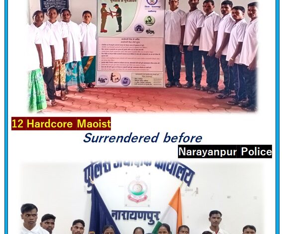 सुरक्षा बलों के लगातार प्रयास से 12 माओवादी नक्सलियों ने आत्मसमर्पण किया।