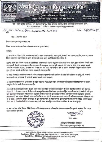 अंतरराष्ट्रीय मानवाधिकार फाउंडेशन बलरामपुर के जिलाध्यक्ष सुदामा राजवाड़े ने कलेक्टर को ज्ञापन सौंपकर कहा कि वाड्रफनगर तहसील क्षेत्र के ग्राम पंचायत पनसरा के एक दिव्यांग युवती प्रान्ती पटेल पिता डोमन पटेल की भूमि पर बंधु लाल पटेल पिता कमल पटेल, इंद्रेश पटेल व त्रिपाठी पटेल ने ज़बरन कब्जा कर रखा है।