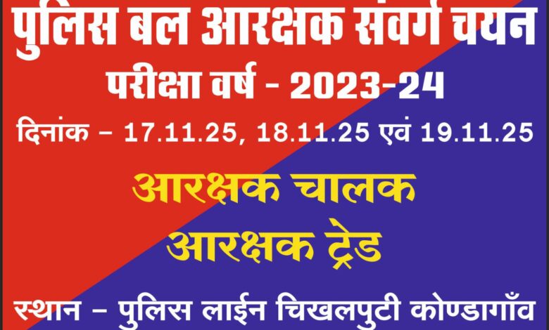 पुलिस मुख्यालय अटल नगर नया रायपुर के आदेशानुसार छत्तीसगढ़ पुलिस बल के आरक्षक भर्ती परीक्षा वर्ष 2023-24 के अंतर्गत आरक्षक (चालक) एवं आरक्षक (ट्रेड )की अभ्यर्थीयो का ट्रेड टेस्ट दिनांक 17 /11/ 2025, 18/11/2025 एवं 19 / 11/2025 को आयोजित किया जाना है