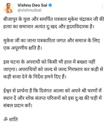 बीजापुर के युवा और समर्पित पत्रकार मुकेश चंद्राकर जी की हत्या का समाचार अत्यंत दु:खद और हृदयविदारक है।