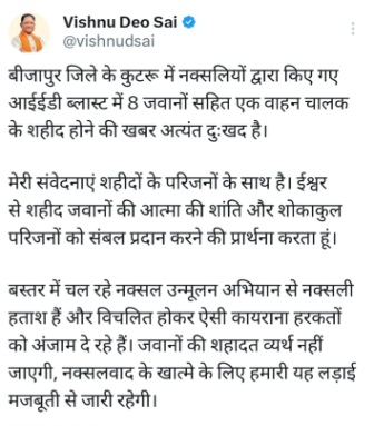 सीएम साय ने बीजापुर नक्सली हमले को लेकर किया ट्वीट,