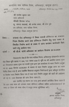 तथा कई दुर्घटना उक्त निर्माणाधीन हॉस्पिटल के सामने हो गए हैं इसलिए भी हॉस्पिटल हेतु निर्मित उपरोक्त भवन को नियम के विपरीत होने के कारण तत्काल बंद कराया जाना आवश्यक है। उपरोक्त शिकायत एवं उसके साथ प्रस्तुत दस्तावेजों के आधार पर आयुक्त नगर पालिका निगम अंबिकापुर के द्वारा 14 फ़रवरी 2025 को राजेश कुमार राम भवन अधिकारी, प्रियंका पटेल, सपना खलखो, रत्नेश कंवर एवं प्रेम दुबे उप अभियंता नगर पालिका निगम अंबिकापुर को उक्त भवन की जांच कर स्पष्ट प्रतिवेदन अभिमत सहित 7 दिवस में प्रस्तुत करने का आदेश दिए।