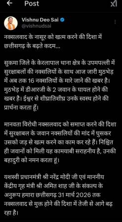 प्रधानमंत्री नरेंद्र मोदी जी एवं माननीय केंद्रीय गृह मंत्री अमित शाह जी के संकल्प के अनुरूप हमारा छत्तीसगढ़ 31 मार्च 2026 तक नक्सलवाद से मुक्त होने की दिशा में तेजी से आगे बढ़ रहा है।