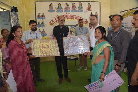 स्व सहायता समूह की महिलाओं ने हैंडलूम से बने खादी गमछा और भित्तिचित्र भेंट कर किया सम्मानित