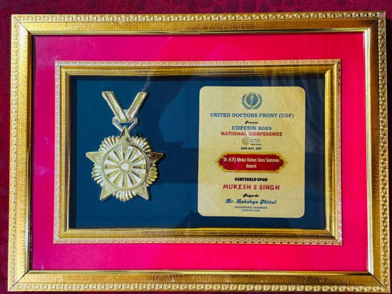 यूडीएफकॉन 2025 के दौरान वरिष्ठ पत्रकार मुकेश एस. सिंह को डॉ. ए.पी.जे. अब्दुल कलाम सेवा सम्मान से सम्मानित करते हुए डॉ. लक्ष्य मित्तल, डॉ. बी. श्रीनिवास, डॉ. नीमेश देसाई, डॉ. ओम प्रकाश और डॉ. सुनील खत्री।