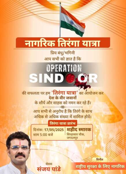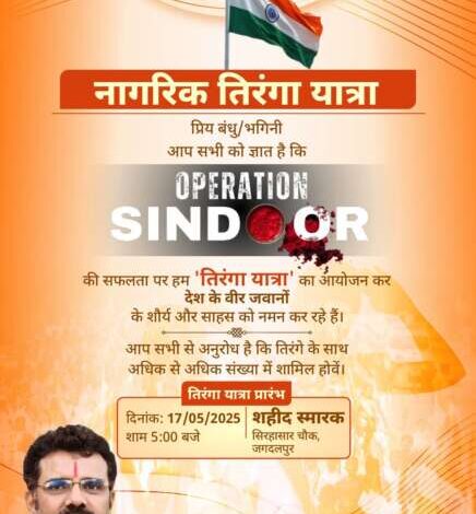 आमको सूचित किया जाता है कि गौरवशाली ऑपरेशन सिंदूर के समर्थन में दिनांक 17/05/2025 को तिरंगा यात्रा का आयोजन किया जा रहा है। यह यात्रा शाम 5:00 बजे शहीद स्मारक,सिरहासार चौक, जगदलपुर से प्रारंभ होकर राष्ट्र को समर्पित होगी ।