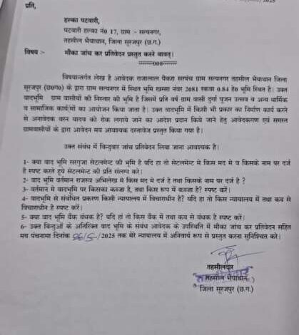 प्रकरण के अनुसार, ग्राम सत्यनगर के सरपंच और ग्रामीणों ने 15 मई 2025 को तहसील भैयाथान में आवेदन देकर शिकायत की थी कि खसरा नंबर 2081, रकबा 0.84 हेक्टेयर की भूमि, जहां ग्रामीण दुर्गा पूजा और अन्य धार्मिक आयोजन करते हैं, पर रामबरन यादव द्वारा निर्माण कार्य किया जा रहा है।