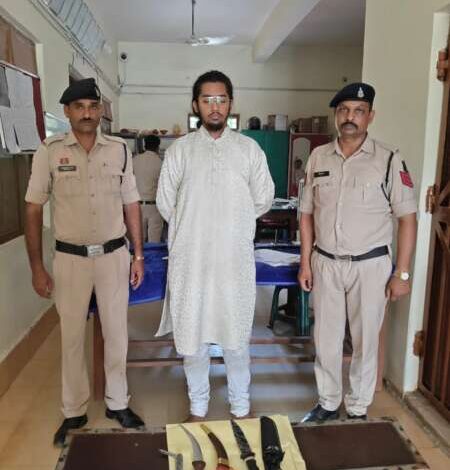 बीती रात अवैध शराब के आरोपियों को छुड़ाने की सिफारिश करने आए युवक के कब्जे से मिला अवैध धारदार हथियार।