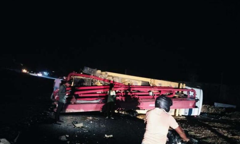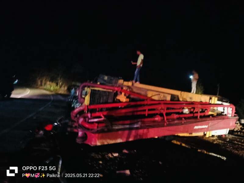 नेशनल हाईवे 130 स्थित हंसडांड में ट्रेलर की ठोकर से हाइड्रोलिक कंक्रीट बूम प्रेशर वाहन सड़क पर पलटा चालक को मामूली चोटे