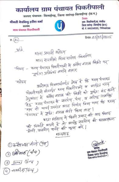 ने बताया कि ग्राम पंचायत पिकरीपाली से अवैध शराब की बिक्री को लेकर ज्ञापन पत्र प्राप्त हुआ है। जिसमें हमारे द्वारा अवैध शराब विक्रेताओं पर कड़ी कार्रवाई किया जाएगा