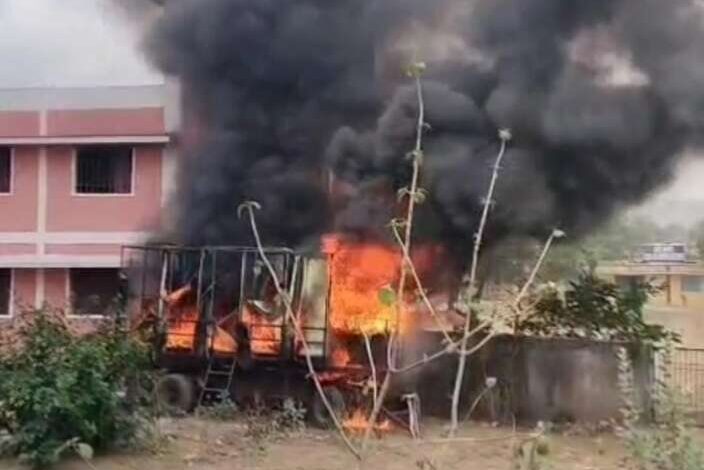 रायगढ़ @खबर सार : छत्तीसगढ़ के कोरबा जिले के पोंडी उपरोड़ा जनपद पंचायत कार्यालय परिसर में आज सुबह एक चलित शौचालय वाहन में अचानक भीषण आग लगने से हड़कंप मच गया। आग की लपटें इतनी तेज थीं कि देखते ही देखते पूरे वाहन को अपनी चपेट में ले लिया, और वाहन पूरी तरह जलकर खाक हो गया। घटना की सूचना स्थानीय लोगों ने तुरंत दमकल विभाग को दी, लेकिन खबर लिखे जाने तक दमकल की कोई टीम मौके पर नहीं पहुंची, जिससे लोगों में प्रशासन के प्रति नाराजगी देखी गई।
