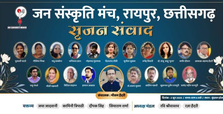 रायपुर. जन संस्कृति मंच ( जसम ) की रायपुर ईकाई द्वारा दो जून की शाम छह बजे स्थानीय वृंदावन हॉल में सृजन संवाद का आयोजन किया जा रहा है. इस आयोजन में 20 से ज्यादा रचनाकार अपनी रचनाओं का पाठ करेंगे.