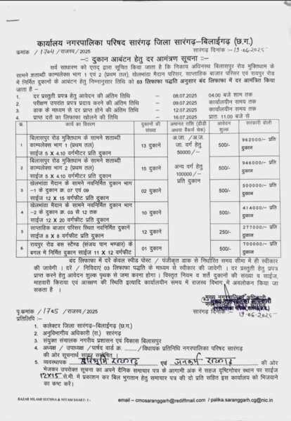 नगर पालिका परिषद सारंगढ़ द्वारा 19 जून 2025 को जारी एक सार्वजनिक सूचना ने अब विवाद का रूप ले लिया है। पत्र क्रमांक 1704/राजस्व/2025 के माध्यम से नगर पालिका परिषद ने अपने अधीनस्थ परिसरों में कुल 53 दुकानों के आबंटन हेतु आम सूचना जारी की थी। हालांकि इस प्रक्रिया में आरक्षण अधिनियमों और सामाजिक न्याय के संवैधानिक सिद्धांतों की अनदेखी किए जाने का गंभीर आरोप सामने आया है।