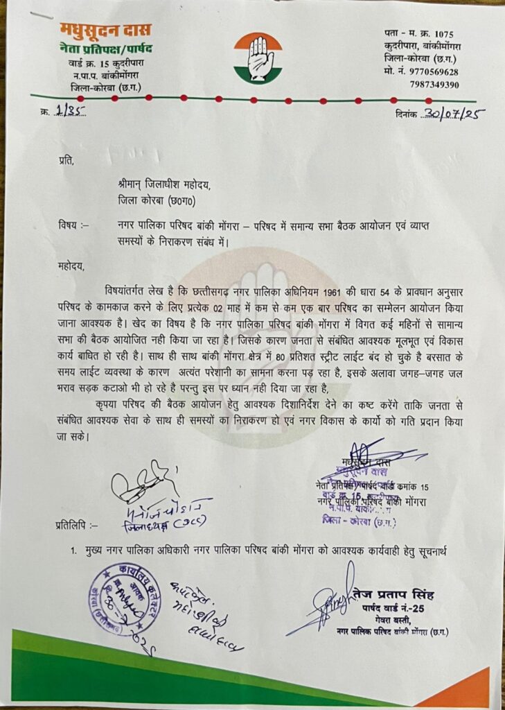 इस अवसर पर नेता प्रतिपक्ष मधुसूदन दास ने कहा कि – छत्तीसगढ़ नगर पालिका अधिनियम ,1961 की धारा 54 के प्रावधान के अनुसार परिषद के काम काज करने के लिए प्रत्येक 2 माह में कम से कम एक बार सम्मेलन करवाना आवस्यक है,खेद का विषय है की नगर पालिका परिषद विगत कई महीनों से सामान्य सभा की बैठक आयोजित नहीं किया जा रहा है,जिसके कारण जनता से संबंधित आवस्यक मूलभूत और विकास कार्य बाधित हो रही है …!