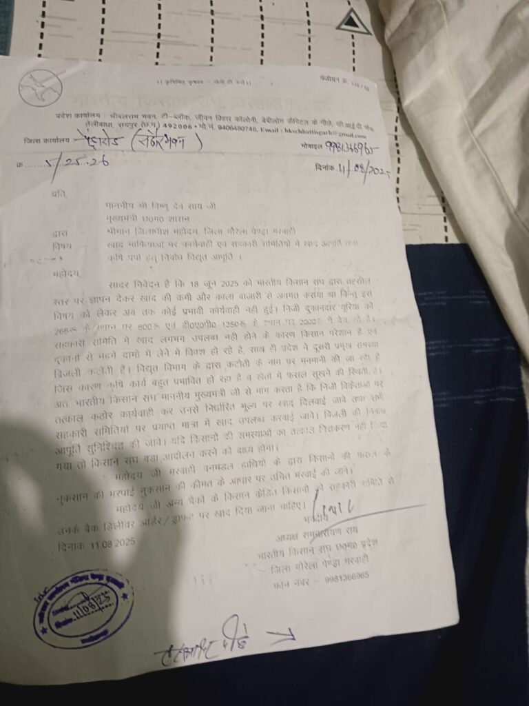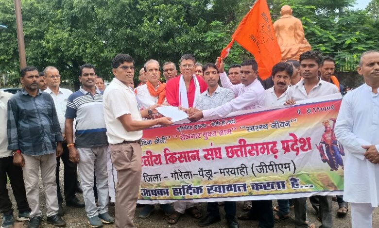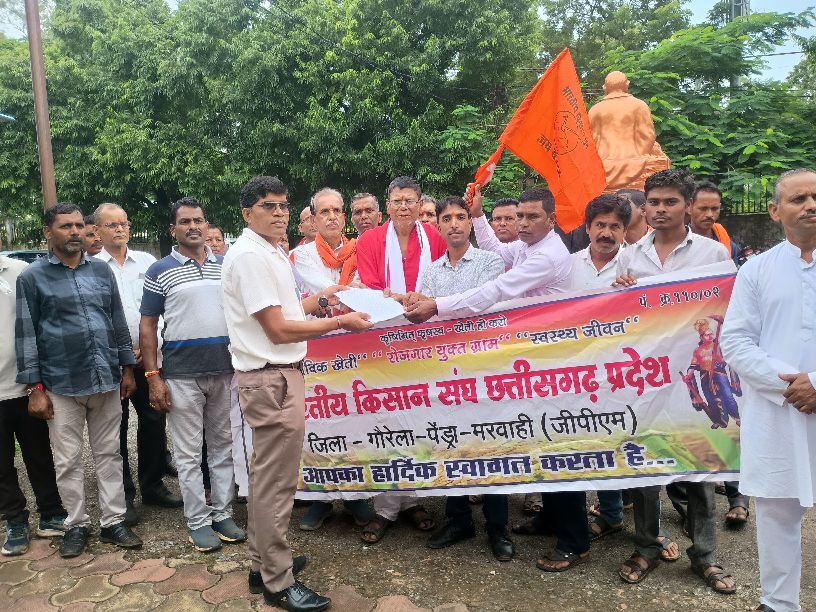 गौरेला-पेंड्रा-मरवाही। भारतीय किसान संघ छत्तीसगढ़ प्रदेश के आह्वान पर जिले के किसानों ने सोमवार को जिला मुख्यालय में प्रदर्शन कर अपनी मांगों के संबंध में ज्ञापन सौंपा। यह ज्ञापन जिला अध्यक्ष रामनारायण राय के नेतृत्व में एडिशनल कलेक्टर देवेन्द्र कुमार सिरमौर को मुख्यमंत्री विष्णुदेव साय के नाम संबोधित किया गया।
