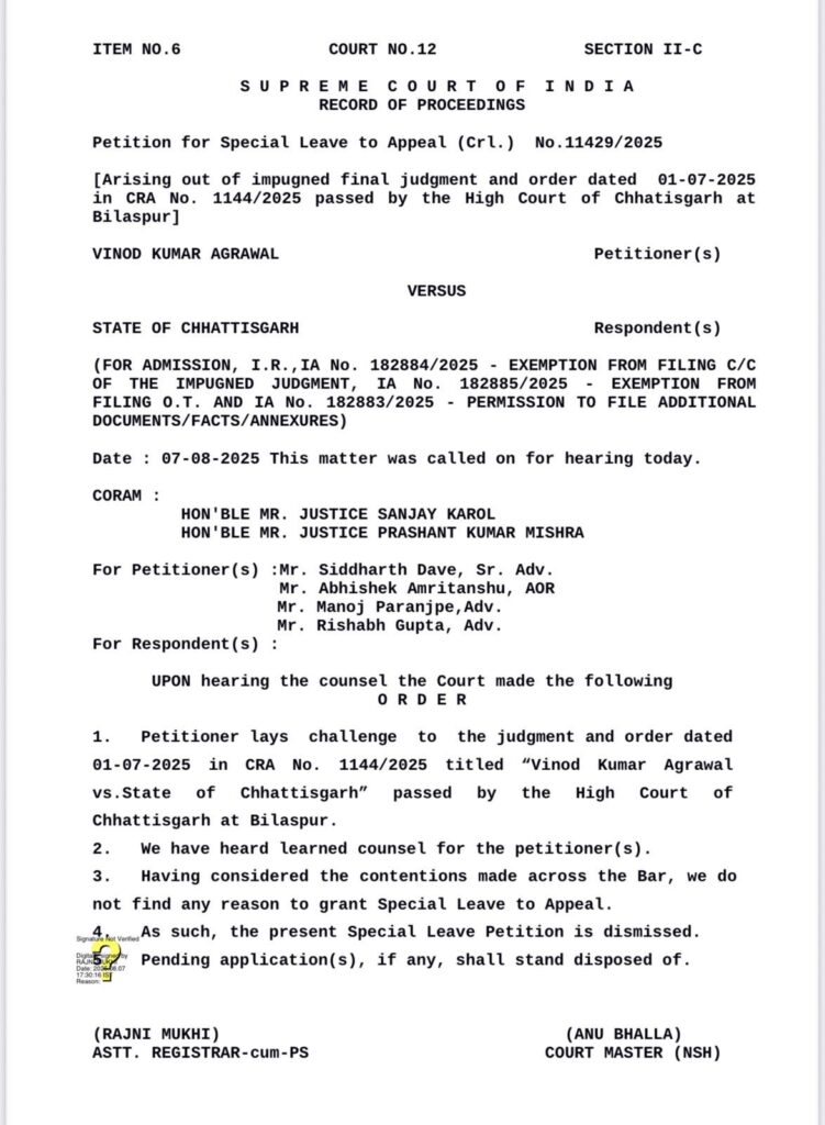 ज़मीन घोटाले, पुलिस-राजनीतिक गठजोड़ और संगठित अपराध के आरोपों से घिरे विनोद कुमार अग्रवाल उर्फ़ मग्गू सेठ को अब सुप्रीम कोर्ट से भी बड़ा झटका मिला है। 7 अगस्त 2025 को सर्वोच्च अदालत ने उनकी स्पेशल लीव पिटीशन (SLP) खारिज कर दी, जिससे छत्तीसगढ़ हाई कोर्ट का आदेश बरकरार रहा।