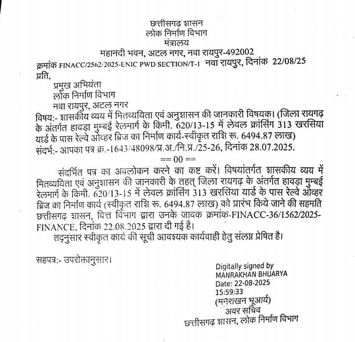 इस संबंध में छत्तीसगढ़ शासन, लोक निर्माण विभाग ने प्रमुख अभियंता (लोक निर्माण विभाग), नवा रायपुर को पत्र जारी कर सूचित किया है कि जिला रायगढ़ के अंतर्गत हावड़ा–मुंबई रेलमार्ग के किमी 620/13–15 पर लेवल क्रॉसिंग 313, खरसिया यार्ड के पास प्रस्तावित रेलवे ओवरब्रिज (स्वीकृत राशि रु. 6494.87 लाख) को प्रारंभ करने की सहमति वित्त विभाग द्वारा दी गई है। उक्त पत्र अवर सचिव मनराखन भूआर्य द्वारा जारी किया गया है। इसके साथ ही वर्षों से ठप पड़ी परियोजना को गति मिलने की उम्मीद है। यह मंजूरी केवल एक परियोजना का आरंभ नहीं, बल्कि शहीद नंदकुमार पटेल के उस अधूरे सपने की पूर्ति है जिसे उनके बेटे और खरसिया विधायक उमेश पटेल और खरसिया विधानसभा के कांग्रेसियों ने हर मोर्चे पर लड़कर साकार किया है।