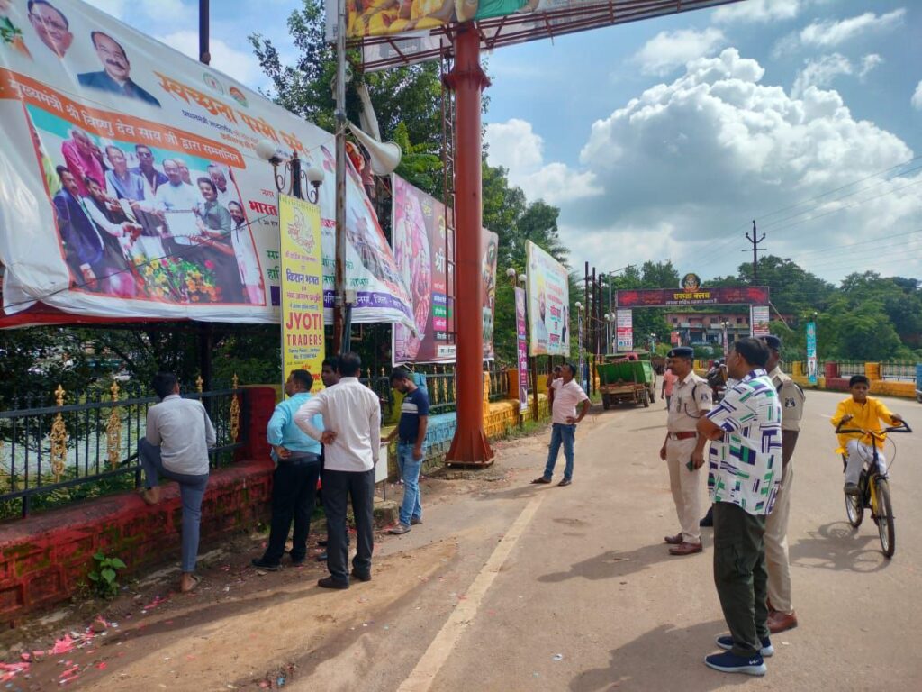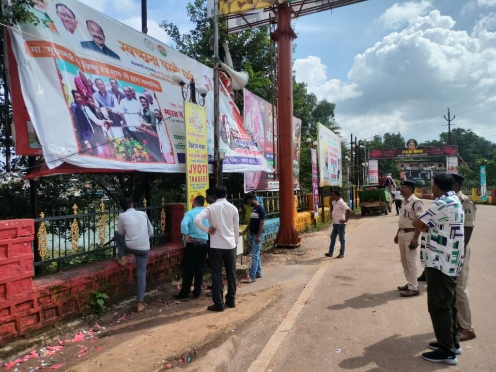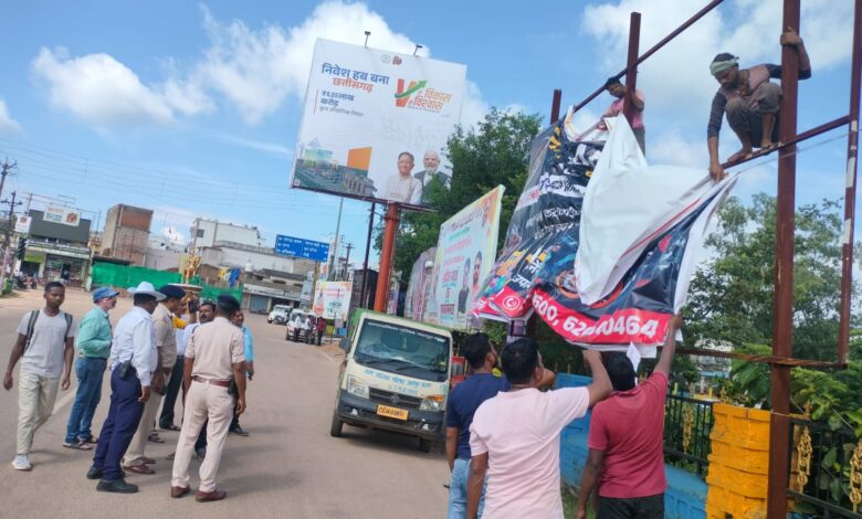जिसके मद्देनजर यातायात पुलिस के द्वारा नगर पालिका जशपुर की सहायता से अनावश्यक व अनधिकृत रूप से, बिना सुरक्षा मानकों के लगाए गए होर्डिंग,पोस्टर, व बैनरों को निकाला जा रहा है, साथ ही भविष्य में ऐसा करते पाए जाने पर,संबंधितों के विरुद्ध कड़ी कानूनी कार्रवाई की जाएगी।