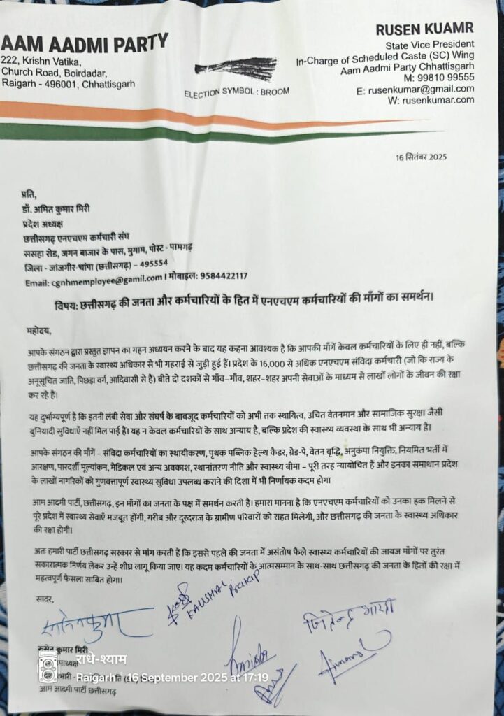 राष्ट्रीय स्वास्थ्य मिशन (एनएचएम) कर्मचारी संगठन की 30 दिनों से चल रही अनिश्चितकालीन हड़ताल के बीच कल, 15 सितंबर 2025 को राज्य स्वास्थ्य सचिव द्वारा एक धमकी भरा पत्र जारी किया गया, जिसमें 16500 कर्मचारियों को नौकरी से निकालने और नई भर्ती का आदेश दिया गया। इस पत्र ने साय सरकार की कथित संवेदनशीलता की पोल खोल दी है, जो बार-बार “परिवार के सदस्य” कहकर कर्मचारियों को भरोसा दिलाती रही, लेकिन अब उनके भविष्य को दांव पर लगाने में तनिक भी संकोच नहीं कर रही।