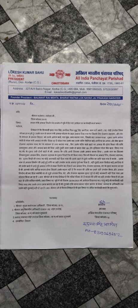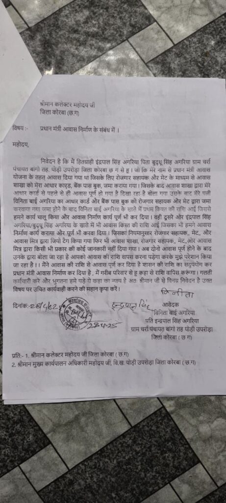 कोरबा । प्रधानमंत्री आवास योजना को लेकर कोरबा जिले के पोड़ी उपरोड़ा ब्लॉक से बड़ा घोटाला सामने आया है। ग्राम पंचायत बांगो की आदिवासी महिला विनिता बाई अगरिया ने आरोप लगाया है कि योजना की राशि से घर बनने के बाद अब उनसे एक लाख रुपये लौटाने का दबाव बनाया जा रहा है। आरोप सीधे सीईओ पोड़ी उपरोड़ा जयप्रकाश डड़सेना और उनके अधीनस्थ कर्मचारियों पर लगाए गए हैं।