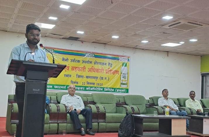 बलरामपुर, 22 सितम्बर 2025/ कृषि विभाग द्वारा बलरामपुर मुख्यालय अंतर्गत बाजारपारा स्थित ऑडिटोरियम में नैनो फर्टिलाइजर जागरूकता कार्यक्रम का आयोजन किया गया। कार्यक्रम में क्षेत्र के ग्रामीण कृषि विस्तार अधिकारियों और समिति प्रबंधको को नैनो फर्टिलाइज़र की महत्ता, उपयोग विधि व सावधानियों की विस्तृत जानकारी दी गई। कृषि विभाग के उप संचालक श्री रामचन्द्र भगत ने बताया कि समय के साथ कृषि में नई-नई तकनीकें जुड़ रही हैं। उन्होंने बताया कि अन्य उर्वरकों की तुलना में नैनो फर्टिलाइज़र अधिक प्रभावी और किफायती है।