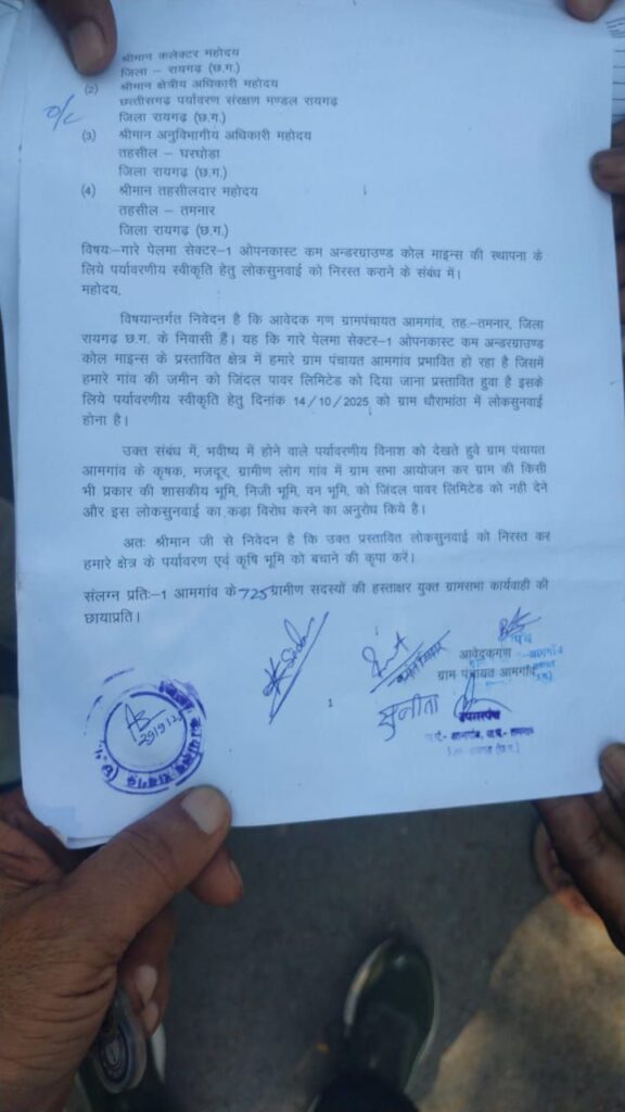रायगढ़ :-तमनार विकासखंड के ग्राम पंचायत आमगांव के ग्रामीणों ने आगामी 14 अक्टूबर 2025 को कलेक्टर रायगढ़ में प्रस्तावित जनदर्शन व जनसुनवाई को निरस्त कराने की मांग उठाई है। इसके लिए गाँव के लगभग 200 महिला-पुरुष जनप्रतिनिधियों सहित ग्रामीण रायगढ़ पहुँचकर प्रशासन के समक्ष अपना विरोध दर्ज कराएंगे।