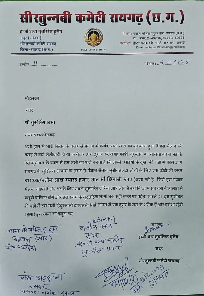 सीरतुन्नबी कमेटी रायगढ़ की अपील पर शहर के मुसलमान भाइयों से 311786/-तीन लाख ग्यारह हजार सात सौ छियासी रुपए पंजाब बाढ़ पीड़ितों के लिए जमा किया गया अभी पिछले माह भारी सैलाब की वजह से पंजाब में काफी ज्यादा जानोमाल का नुकसान हुआ है इस सैलाब की वजह से वहां खेती बाड़ी ,कारोबार, घर दुकानो को काफी नुकसान का सामना करना पड़ा है ऐसे मुसीबत के वक्त में रायगढ़ के मुसलमानो ने अपने पंजाब में रहने वाले भाइयों के दर्द और तकलीफ को समझा