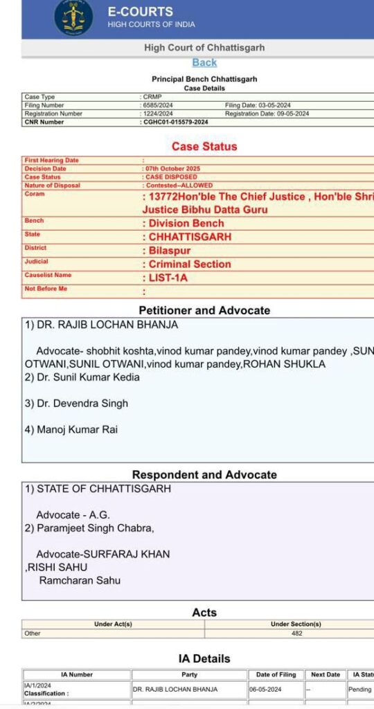 दयालबंद निवासी एक युवक को गंभीर स्थिति में 25 दिसंबर 2016 को अपोलो हॉस्पिटल में भर्ती कराया गया था। मरीज का मल्टीपल ऑर्गन फेल्योर के कारण अगले ही दिन 26 दिसंबर को निधन हो गया। पोस्टमॉर्टम के बाद विसरा को रासायनिक परीक्षण के लिए भेजा गया था, जिसकी रिपोर्ट में किसी भी तरह के सल्फास के अवशेष नहीं मिले। इस मामले में परिजनों की शिकायत पर सरकंडा थाने में डॉ. सुनील कुमार केडिया, डॉ. देवेंद्र सिंह, डॉ. राजीव लोचन भांजा और मनोज कुमार राय के खिलाफ मामला दर्ज किया गया था। चारों ने *सीनियर एडवोकेट सुनील ओटवानी* के जरिए हाई कोर्ट में याचिका लगाई थी।