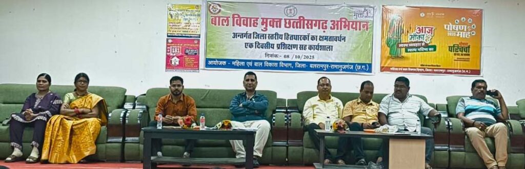 बलरामपुर, 09 अक्टूबर 2025/ कलेक्टर श्री राजेन्द्र कटारा के निर्देशन एवं जिला पंचायत सीईओ श्रीमती नयनतारा सिंह तोमर के मार्गदर्शन में जिला कार्यक्रम अधिकारी, महिला एवं बाल विकास विभाग के द्वारा जिला मुख्यालय में स्थित आडोटेरियम भवन में बाल विवाह मुक्त छत्तीसगढ़ अभियान के तहत् जिलें के समस्त बाल विवाह प्रतिषेध अधिकारियों एवं सर्व संबंधितों का एक दिवसीय जिला स्तरीय प्रशिक्षण सह कार्यशाला आयोजित किया गया।
