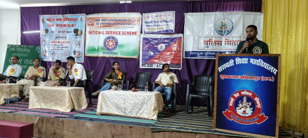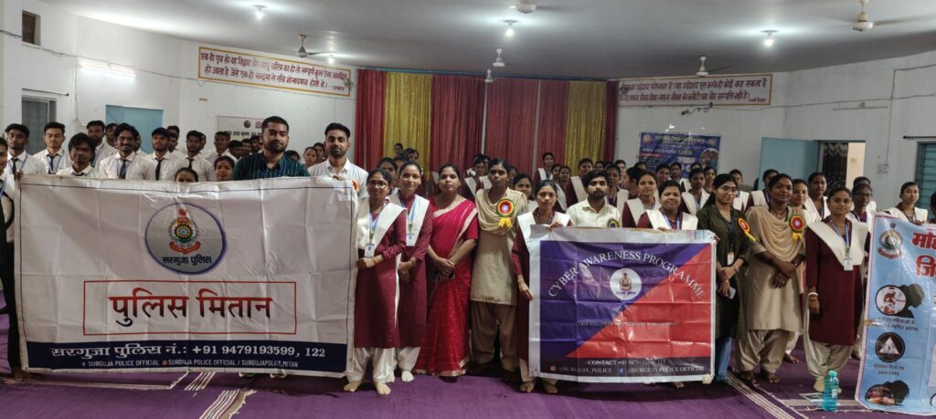छात्र छात्राओं के विधिक अधिकारों, यातायात नियमो की जानकारी, साइबर अपराध एवं सुरक्षा, नवीन क़ानून संहिता एवं महिलाओ से सम्बंधित अपराधों के बारे मे विस्तृत जानकारी प्रदान कर छात्र छात्राओं कों जागरूक करने हेतु वरिष्ठ पुलिस अधीक्षक सरगुजा श्री राजेश कुमार अग्रवाल (भा.पु.से.) के दिशा निर्देशन मे पुलिस टीम कों स्कूल कॉलेज मे छात्राओं के बीच पहुंचकर कार्यक्रम का आयोजन कर जागरूकता उत्पन्न करने हेतु निर्देशित किया गया है, इसी क्रम मे साइबर वालेंटियर एवं महिला पुलिस स्टाप द्वारा सरस्वती शिक्षा महाविद्यालय में साइबर सुरक्षा, यातायात जागरूकता एवं महिला सुरक्षा सम्बन्धी जागरूकता कार्यक्रम आयोजित किया गया।