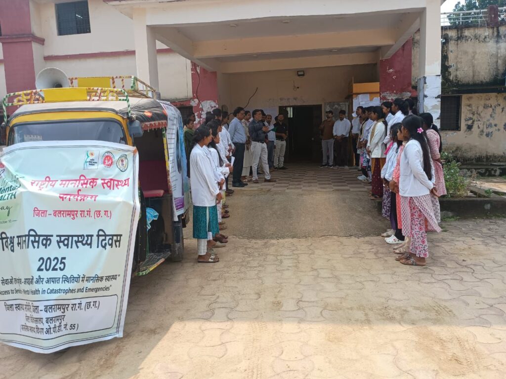बलरामपुर 11 अक्टूबर 2025/ राष्ट्रीय मानसिक स्वास्थ्य दिवस के अवसर पर में कलेक्टर श्री राजेन्द्र कटारा के निर्देशन एवं जिला पंचायत सीईओ श्रीमती नयनतारा सिंह तोमर के मार्गदर्शन में मुख्य चिकित्सा एवं स्वास्थ्य अधिकारी कार्यालय में राष्ट्रीय मानसिक स्वास्थ्य कार्यक्रम के अंतर्गत विश्व मानसिक स्वास्थ्य दिवस पर शपथ एवं जन-जागरूकता कार्यक्रम का आयोजन किया गया।