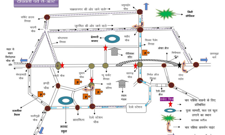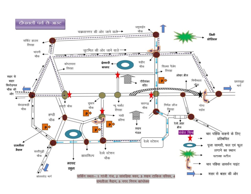 गांधी प्रतिमा, गोगाराइस मिल, हण्डी चौक, सारंगढ़ (अग्रसेन) चौक और गद्दी चौक क्षेत्र में चार पहिया वाहनों का प्रवेश पूर्णतः प्रतिबंधित रहेगा।