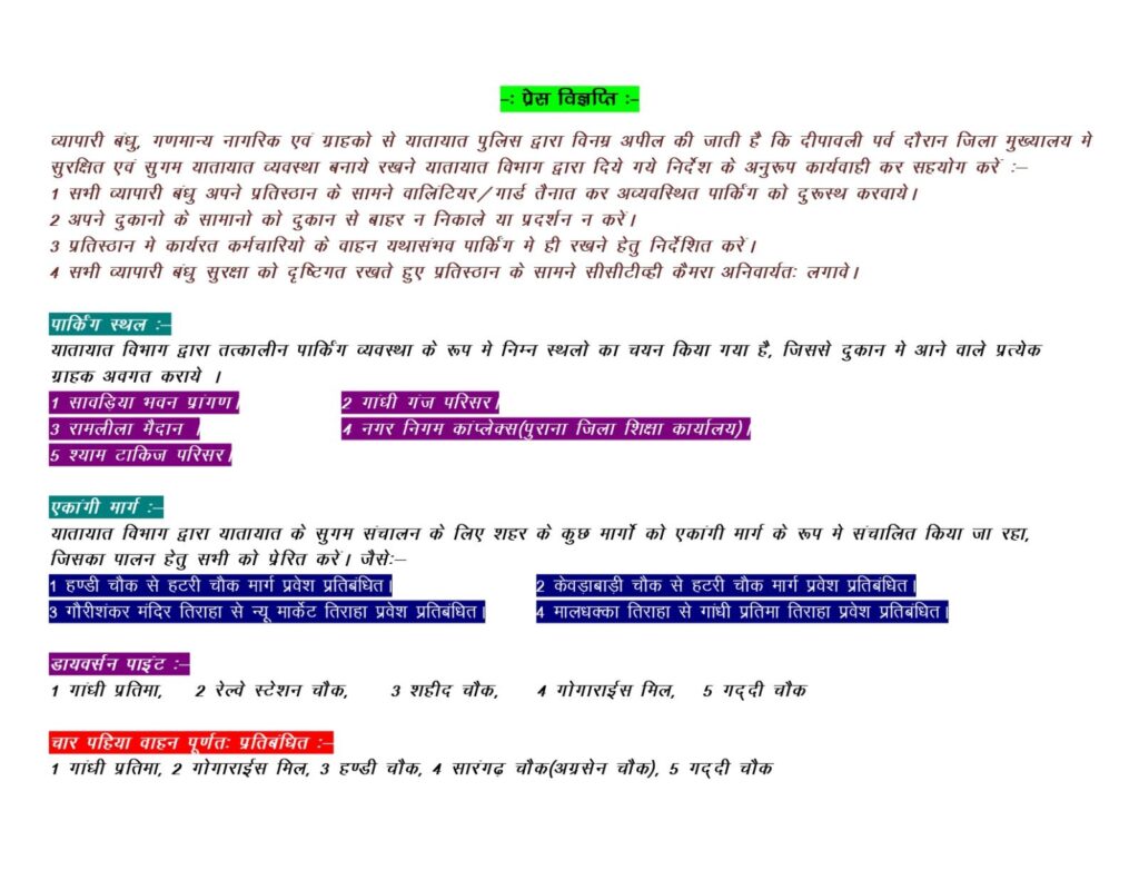 दीपावली पर्व के दौरान जिला मुख्यालय में सुगम एवं सुरक्षित यातायात व्यवस्था बनाए रखने हेतु यातायात पुलिस ने व्यापारियों, गणमान्य नागरिकों और ग्राहकों से सहयोग की अपील की है।