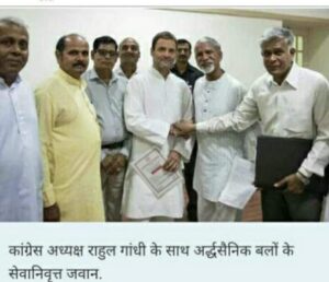 नई दिल्ली । अलॉइंस ऑफ ऑल एक्स पैरामिलिट्री फोर्सेस वेलफेयर एसोसिएशन द्वारा जननायक राहुल गांधी जी से की गई मुलाकात का सीधा असर देखने को मिला जब महागठबंधन द्वारा घोषित अपने बिहार चुनावी घोषणापत्र/वचन पत्र में पूर्व सैनिक एवं अर्धसैनिकों के लिए सौगात दी।