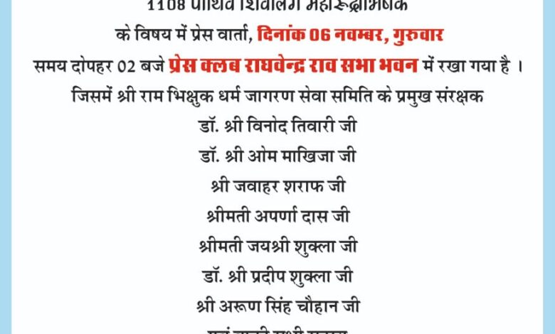 18 जनवरी 2026, रविवार के भव्य आयोजन 1108 पार्थिव शिवलिंग महारूद्राभिषेक के विषय में प्रेस वार्ता दिनांक 06 नवम्बर, गुरूवार समय दोपहर 02 बजे प्रेस क्लब राघवेन्द्र राव सभा भवन में रखा गया है।