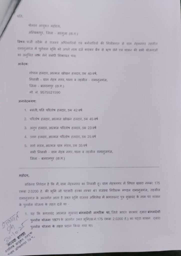 रायपुर/बलरामपुर।बलरामपुर जिले के रामानुजगंज राजस्व अंतर्गत ग्राम नेहरू नगर निवासी गोपाल हलदार ने सरगुज़ा आयुक्त, पुलिस महानिरीक्षक, बलरामपुर कलेक्टर, एसपी, एसडीएम, थाना, तहसील कार्यालय को ज्ञापन सौंपकर कहा कि राजस्व के अधिकारी-कर्मचारियों की मिली भगत से पुनर्वास की भूमि को दबंगो ने अपने नाम नामांतरण कराकर बैंक से ऋण लेकर शासन की योजनाओं का लाभ उठा रहे हैं।