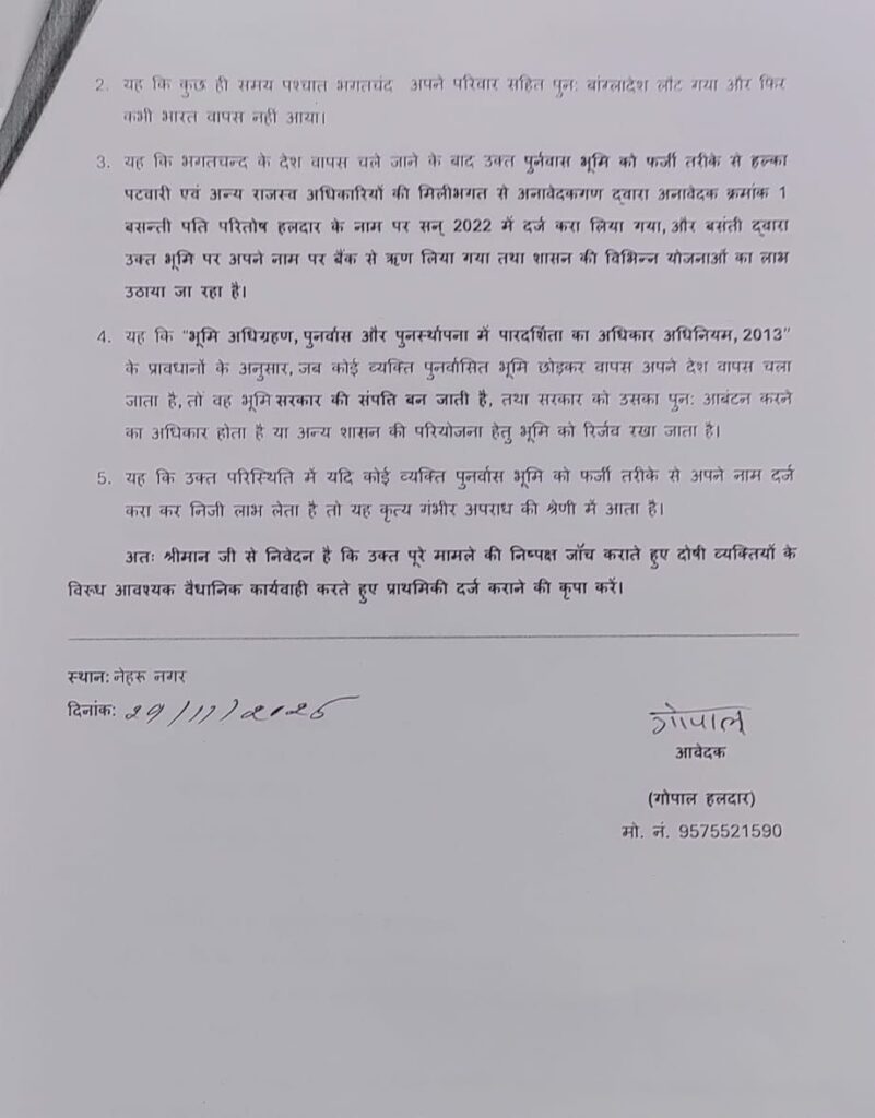 भगतचंद के देश वापस चले जाने के बाद उक्त पुर्नवास भूमि को फर्जी तरीके से हल्का पटवारी एवं अन्य राजस्व अधिकारियों की मिलीभगत से ग्राम नेहरू नगर रामानुजंगज निवासी 42 वर्षीय बसंती पति परितोष हलदार, 45 वर्षीय परितोष हलदार पिता खोखन हलदार, 23 वर्षीय अनुप हलदार पिता परितोष हलदार, 25 वर्षीय उत्तम हलदार पिता परितोष हलदार व 35 वर्षीय सत्तो मंडल पिता चारू मंडल ने बसंती पति परितोष हलदार के नाम पर 2022 में दर्ज करा लिया और बसंती द्वारा उक्त भूमि पर अपने नाम पर बैंक से ऋण लेकर शासन की विभिन्न योजनाओं का लाभ उठाया जा रहा है।