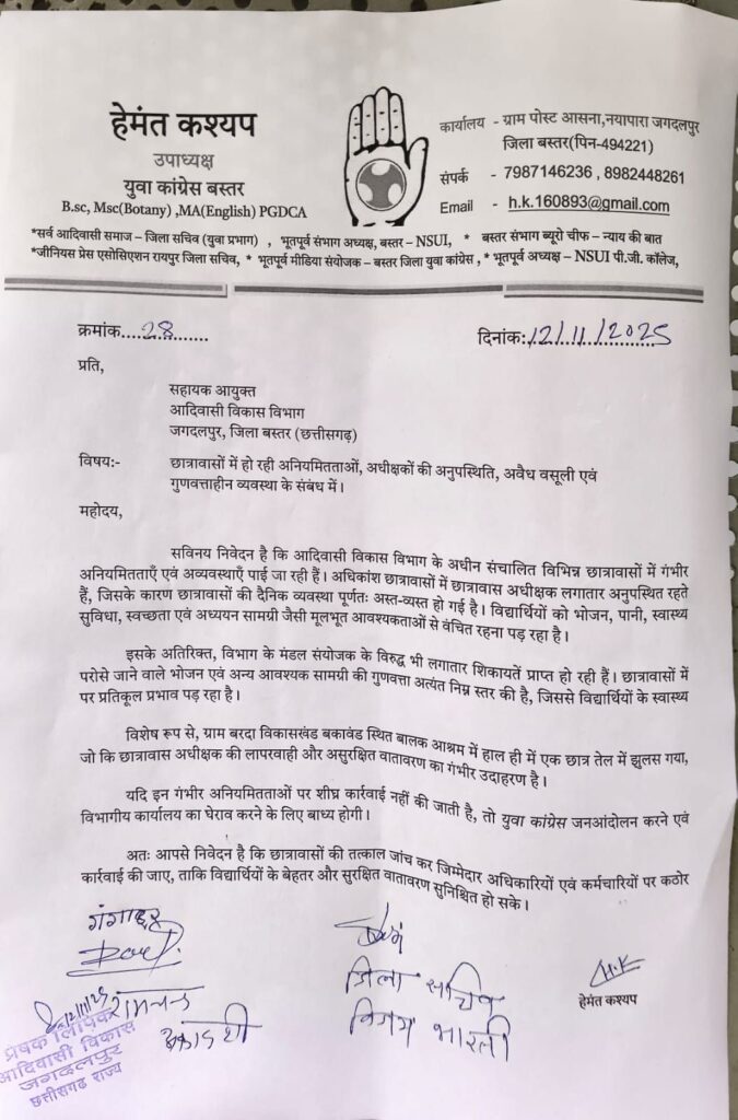 जगदलपुर, 12 नवम्बर 2025। आदिवासी विकास विभाग के अधीन संचालित विभिन्न छात्रावासों में हो रही गंभीर अनियमितताओं, अधीक्षकों की अनुपस्थिति, अवैध वसूली तथा गुणवत्ताहीन व्यवस्था को लेकर आज युवा कांग्रेस जिला उपाध्यक्ष हेमंत कश्यप के नेतृत्व में युवा कांग्रेस पदाधिकारियों ने सहायक आयुक्त, आदिवासी विकास विभाग को ज्ञापन सौंपा।