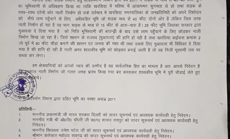 खरसिया के वार्ड क्रमांक 08 और 16 के बाईपास क्रमांक–2 में नगर पालिका द्वारा बनाई जा रही नाली को लेकर क्षेत्रवासियों ने विरोध जताया। उनका आरोप है कि नाली निर्धारित शासकीय भूमि को छोड़कर निजी भूमिस्वामी के नजदीक बनाई जा रही है, जिससे शासकीय भूमि पर कब्जे का खतरा उत्पन्न हो गया है।