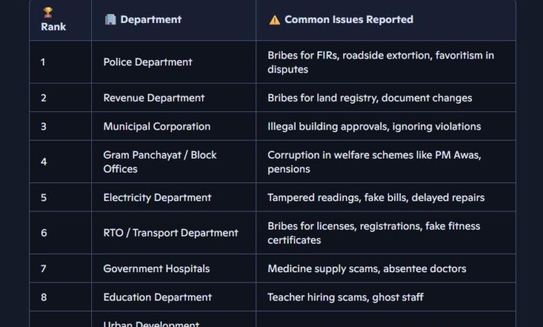 राष्ट्रीय अपराध जांच ब्यूरो ने भारत में दस सबसे भ्रष्ट विभागों की सूची जारी की है
