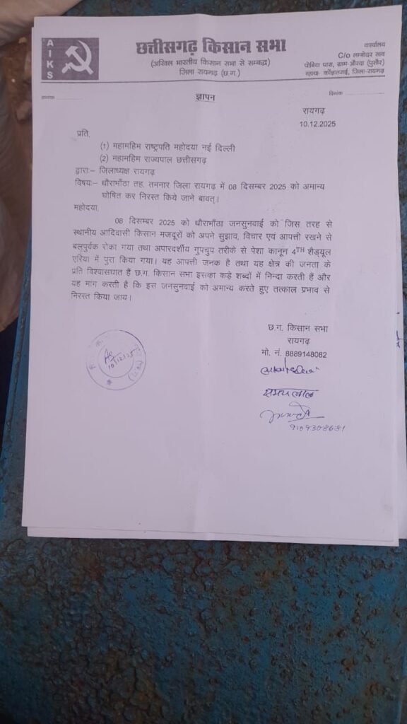 किसान सभा ने अपने ज्ञापन में आरोप लगाया है कि धौराभाँठा में आयोजित जनसुनवाई पूरी तरह से अवैध, अपारदर्शी और लोकतांत्रिक मूल्यों के विपरीत थी। संगठन ने कहा कि जिस प्रकार स्थानीय आदिवासी, किसान एवं मजदूरों को अपने सुझाव, विचार तथा आपत्तियाँ रखने से बलपूर्वक रोका गया, वह न केवल संविधान प्रदत्त अधिकारों का उल्लंघन है बल्कि क्षेत्र की जनता के साथ गंभीर विश्वासघात भी है।