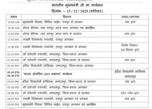 केंद्रीय गृह मंत्री दोपहर 2.45 बजे से शाम 4.45 बजे तक Bastar Olympic Samapan Samaroh के समापन समारोह में शामिल रहेंगे। इस दौरान खिलाड़ियों, आयोजकों और स्थानीय प्रतिनिधियों से संवाद की भी संभावना है।